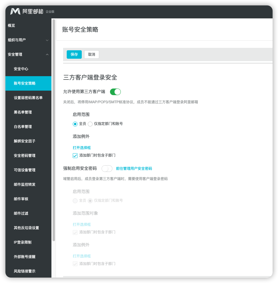 另外,如果你使用的是阿里云企业邮箱,还需要到管理员账户后台配置以下几个选项,邮件发送功能才能正常使用: