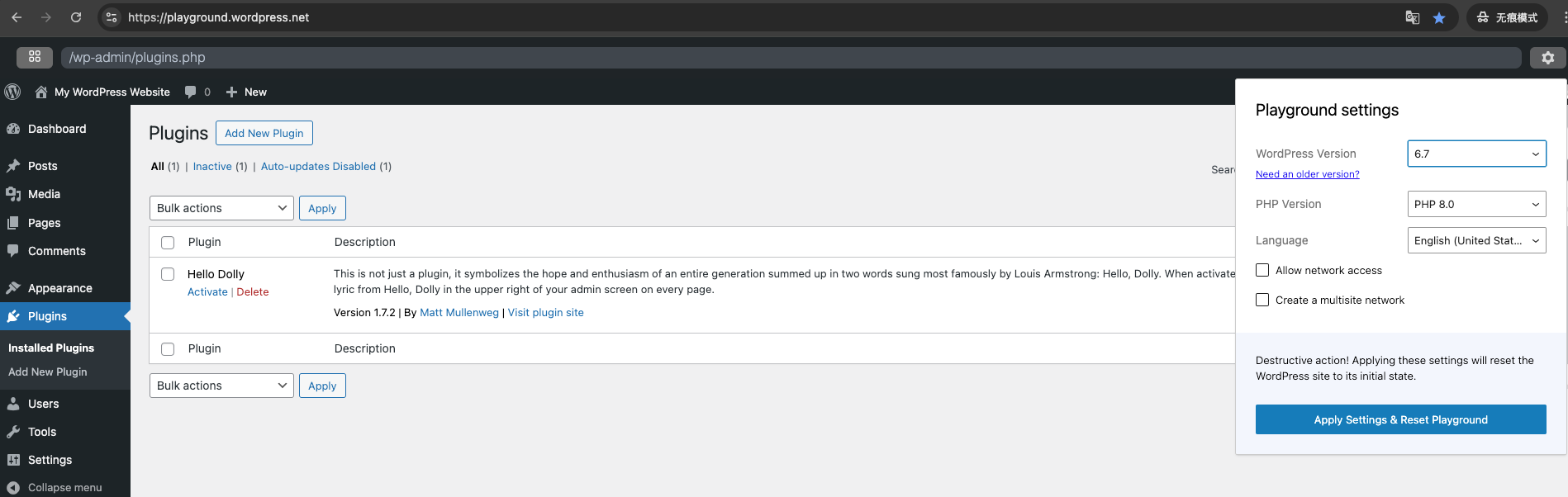你是否曾想尝试 WordPress,但又担心安装过程复杂?或者作为开发者,想要快速测试一个插件或主题,却不想配置本地环境?现在,WordPress Playground 为你提供了一个完美的解决方案!如下图所示: