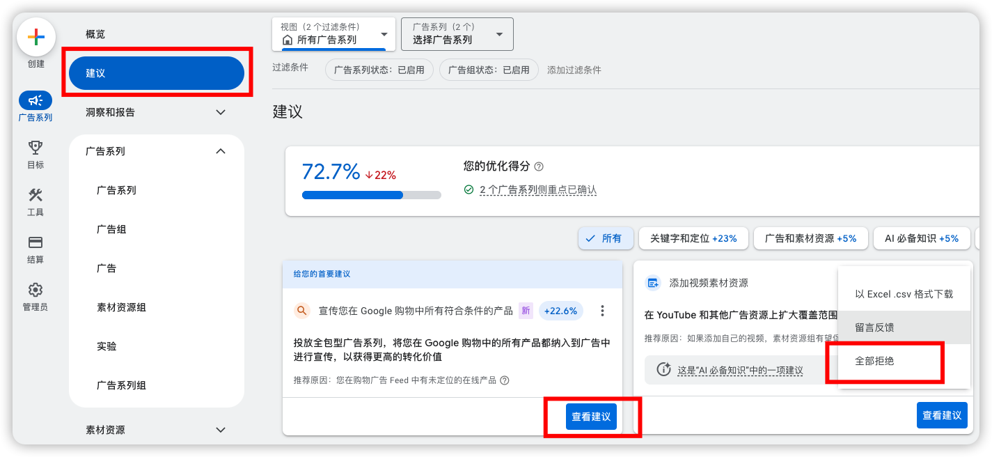 其实很简单,我们先来到广告系列的【建议】模块,然后将每个建议进行【全部拒绝】或者【查看建议接受】就可以了。如下图所示: