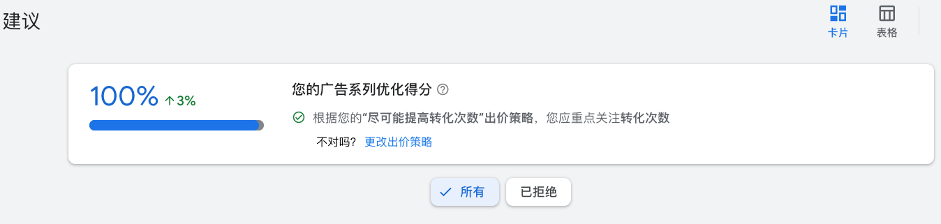 优化得分是Google Ads后台为你的广告系列提供的一个建议性指标,范围从0%到100%。它会根据系统判断的账户结构、关键词质量、出价策略、广告相关性等方面,给出一系列“优化建议”。例如:建议你切换为智能出价,添加更多的关键词,启用受众扩展,增加广告组中的响应式广告,这些建议确实可以帮助账户更符合谷歌系统的“最佳实践”,但并不一定能直接带来更高的转化率。
