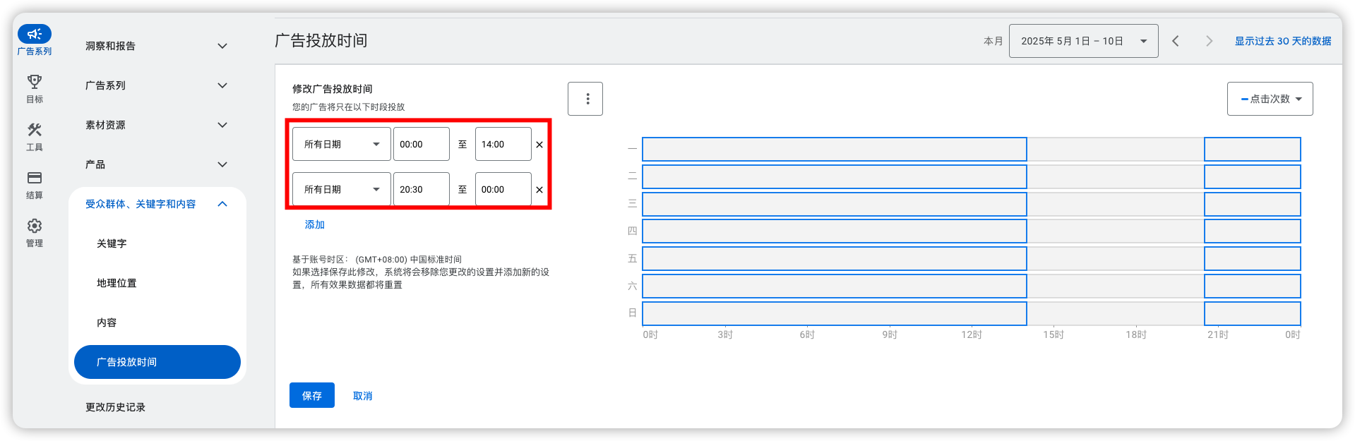 由于 Google Ads 的广告时间不能跨日(不能设“从晚上 8:30 到第二天 14:00”作为一段),你需要分成两段设置每天的时间段: