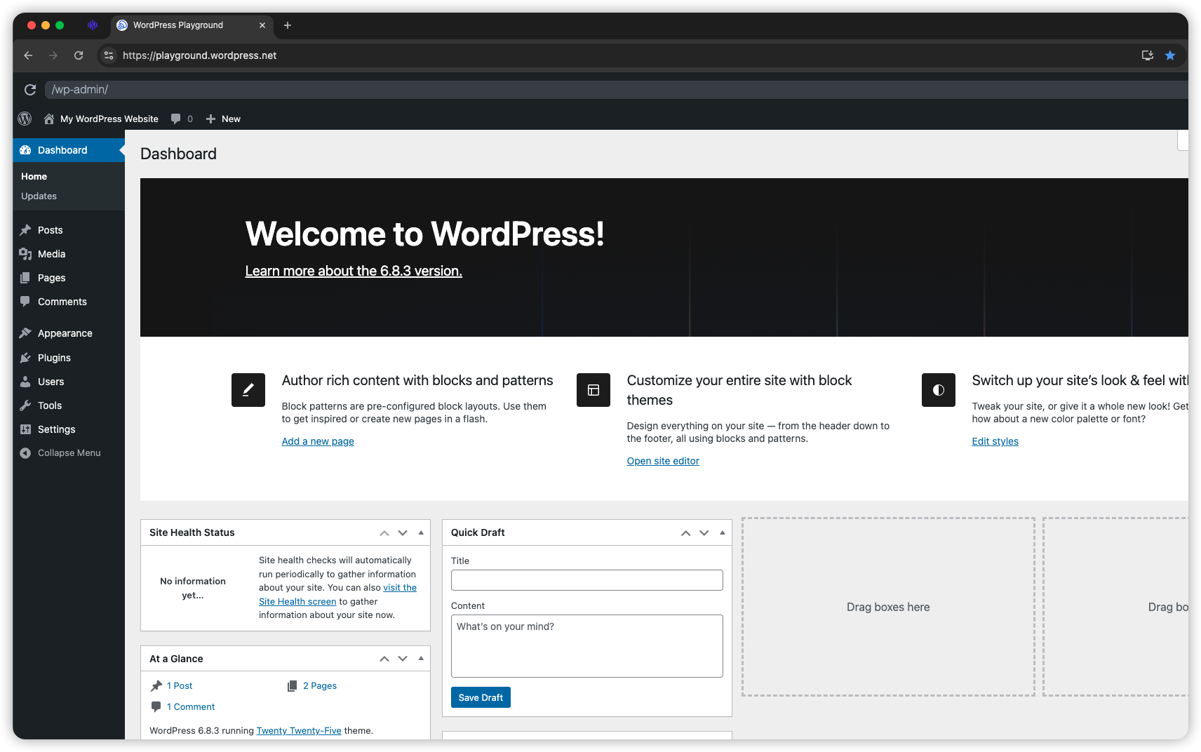 你可以把WordPress Playground理解成一个 “临时体验馆” 。当你刷新当前页面或者关闭浏览器标签页后,你在这个“游乐场”里做的所有修改(写的文章、装的插件等)都会消失。它的主要目的是【学习和测试】,而不是【搭建永久网站】。